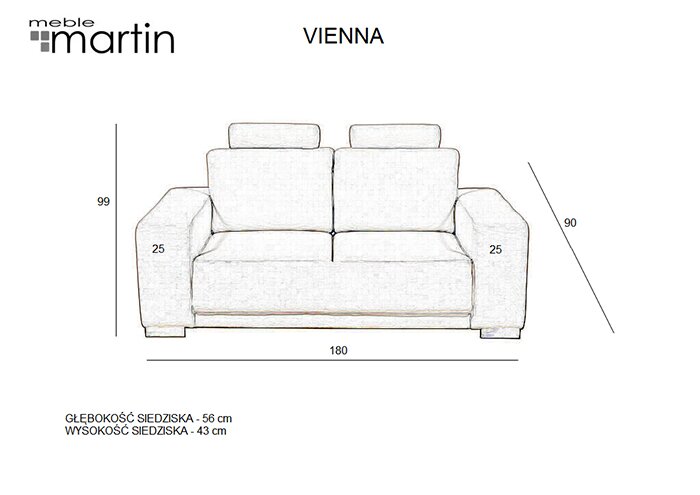 Jedno, dwu lub trzyosobowa sofa, pasuje do nowoczesnych wnętrz. Jej misterne wykończenie sprawia, że nie da się wobec niej przejść obojętnie. Na tyle oparcia znajdują się regulowane zagłówki, dodatkowym atutem są metalowe nogi, które nadają jej eleganckiego wyglądu.